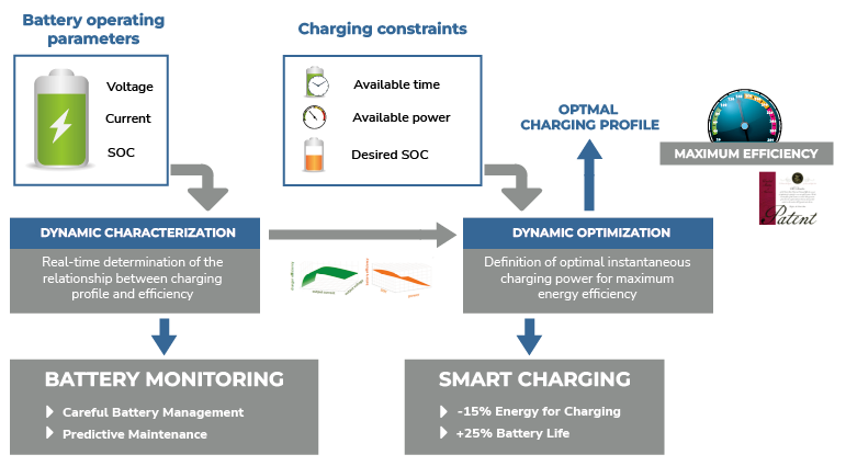 Ciò è ottenuto grazie al nostro metodo brevettato per la caratterizzazione e l’ottimizzazione dinamica dell’efficienza della specifica accoppiata batteria/caricabatteria, consentendo vantaggi unici in termini di risparmio energetico ed aumento della durata della vita della batteria.